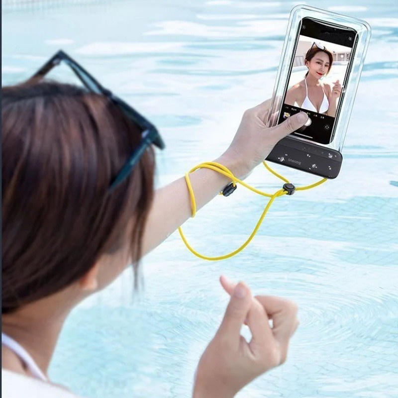 - Bạn muốn bảo vệ chiếc điện thoại an toàn khi đi du lịch đặc biệt là những bức ảnh thật đẹp ở dưới nước mà không cần phải lo nghĩ cách bảo vệ chiếc smartphone khỏi bị vào nước, Baseus đã giúp bạn làm điều đó bằng sản phẩm Túi chống nước Baseus Let''s go Slip Cover Waterproof Bag chuyên dùng cho các dòng smartphone Andriod và iPhone.- Túi chống nước dùng cho điện thoại Baseus Let''s go Slip Cover Waterproof Bag là sản phẩm thuộc dòng Let's go chuyên dùng cho thể thao và các hoạt động thể chất ngoài trời của Baseus . Sản phẩm được làm bằng nhựa dẻo cao cấp và sợi nylon carbon siêu bền (TPU + ABS + Nylon) giúp cho túi có tính đàn hồi cao và độ bền cực tốt. Có thể sử dụng cho nhiều loại điện thoại khác nhau với kích thước màn hình từ 7.2 inch trở xuống.