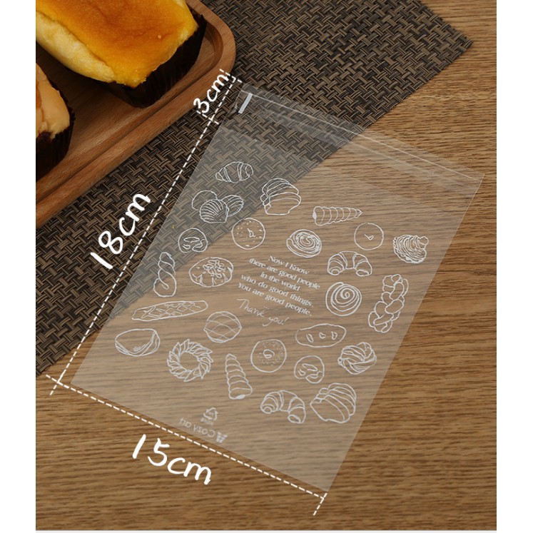 Túi Dán Nilon Đựng Bánh Mì Ngọt In Hình trong suốt (100 cái) dài 18cm, ngang 15cm, dán miệng 3cm