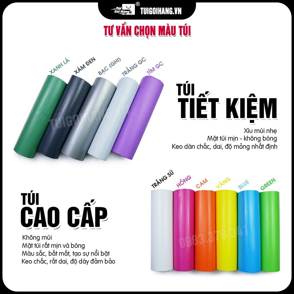 ● Màu cao cấp: trắng sứ, hồng, cam, vàng, green - làm từ 100% nhựa nguyên sinh, mặt túi có độ bóng mịn cao, sờ các giác mượt tay. Các màu này sẽ dày dặn hơn và dai hơn màu tiết kiệm, phù hợp gói các hàng nặng hơn.