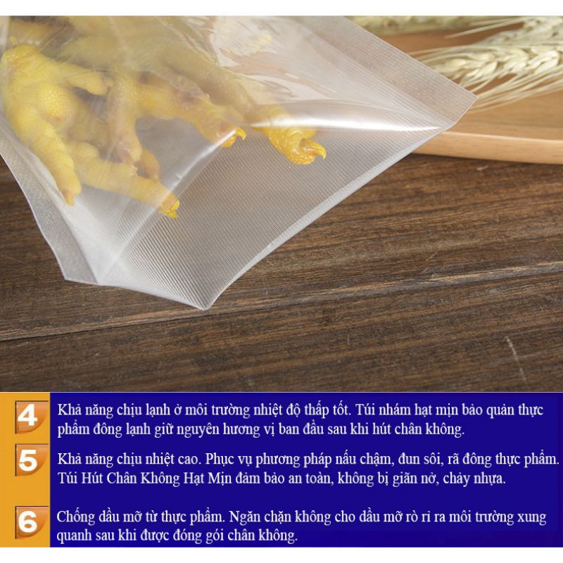 - Túi hút chân không 1 mặt nhám 1 mặt trơn có độ dẻo và dai cực tốt, có thể bỏ vào lo vi sóng mà các hạt nhựa nguyên sinh ko hề tan chảy.