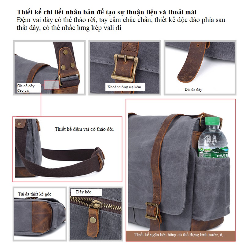 Được làm từ vải Kaki với lớp phủ SBS bên ngoài giúp chống thấm nước kết hợp với da bền dai làm nổi bật từng chi tiết nhỏ nhất của túi.