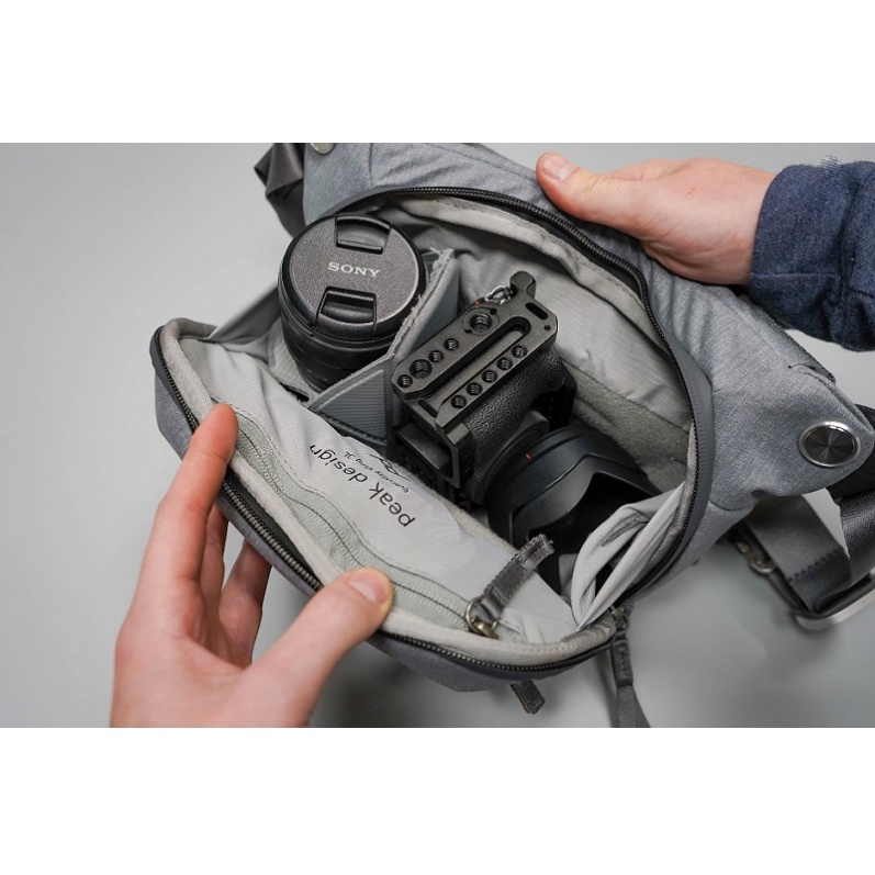 Túi Peak Design Everyday Sling v2 là thiết kế đỉnh cao, tùy chọn mang theo sự nhỏ gọn, linh hoạt, có thể đeo quanh eo hoặc như một chiếc túi đeo chéo. Khi được sử dụng như một chiếc địu, dây đeo chống trượt có thể được cấu hình để đeo qua vai phải hoặc trái. Được thiết kế để vừa khít với cơ thể, khóa kéo Everyday Sling v2 cho phép dễ dàng tiếp cận ngăn chính, bao gồm một bộ chia có thể được cấu hình theo thiết bị cụ thể được mang theo. Dải phân cách có thể gập lại và có thể đặt các bề mặt cong như độ bám của máy ảnh với ống kính kèm theo. Trong quá trình sử dụng, dải phân cách có thể gập lại giúp tăng cường bảo vệ giữa các bề mặt cong và các vật dụng lân cận đồng thời giảm thiểu diện tích giữa chúng để sử dụng hiệu quả hơn không gian của ngăn chính.