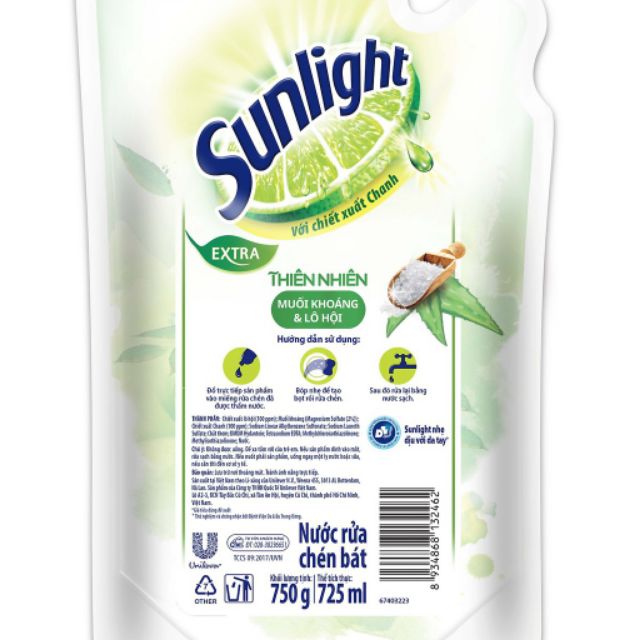 TÚI NƯỚC RỬA CHÉN BÁT SUNLIGHT 750g THIÊN NHIÊN MUỐI KHOÁNGNguyên liệu ngoại nhập, không chất tạo màu