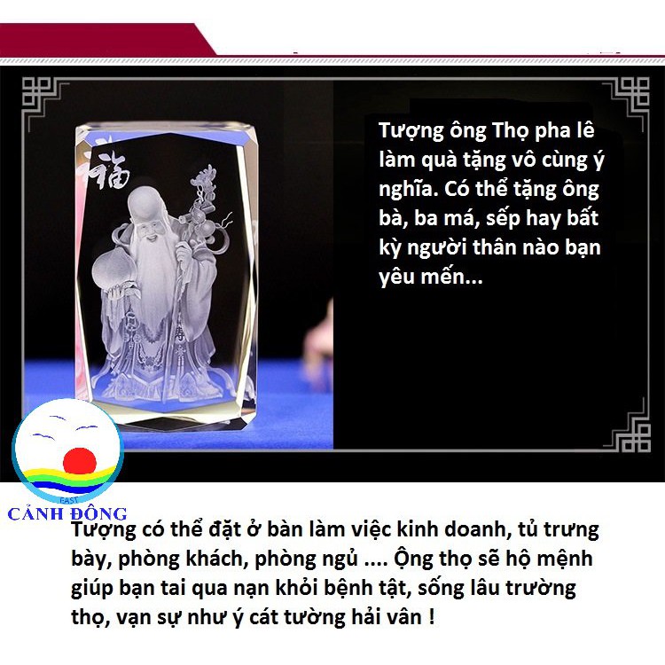 • Một bức tượng tuy nhỏ nhưng chứa đựng nhiều ý nghĩa to lớn, hãy sử tượng pha lê ông Thọ 3D để trang trí cho bàn làm việc, bàn học, tủ tivi, kệ sách, xe ô tô,… để mang lại sư tươi mới và may mắn cho không gian của bạn. Ông Thọ sẽ hộ mệnh giúp bạn tai qua nạn khỏi bệnh tật, sống lâu trường thọ, vạn sự như ý cát tường.