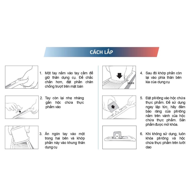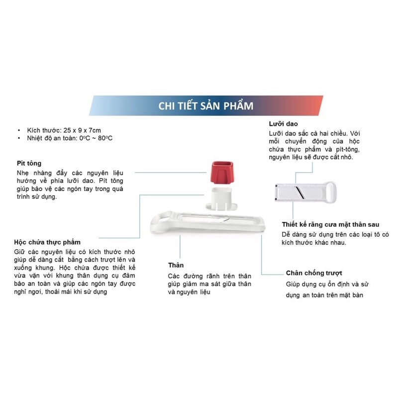 Giữ các nguyên liệu có kích thước nhỏ giúp dễ dàng cắt bằng cách trượt lên và trượt xuống khung. Hộc chứa được thiết kế vừa vặn với khung thân dụng cụ đảm bảo an toàn và giúp các ngón tay được nghỉ ngơi và thoải mái khu sử dụng