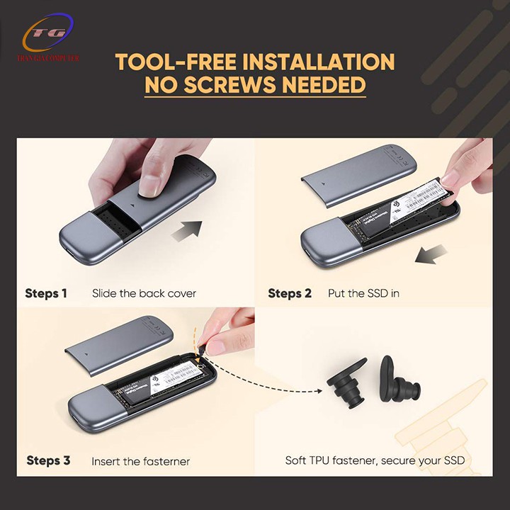 Không cần vít hoặc tuốc nơ vít. Chỉ cần trượt vỏ kim loại phía sau để mở caddy, sau đó cắm SSD M.2 của bạn vào đầu nối B-Key SATA NGFF và sử dụng dây buộc đi kèm để cố định nó vào vị trí, sau đó đóng nắp.
