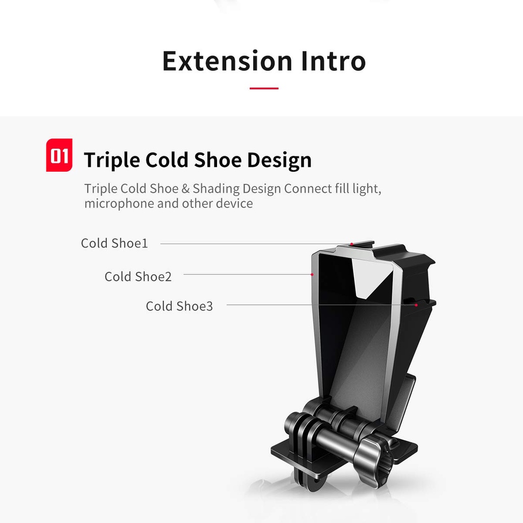 ◾【3 Cold Shoe Mount】 Có 3 Cold shoe trên gương selfie, cho phép bạn gắn 2 đèn video led 1 micrô hoặc bạn có thể gắn thiết bị quay phim khác mà bạn muốn, khả năng mở rộng phong phú cho gopro vlog