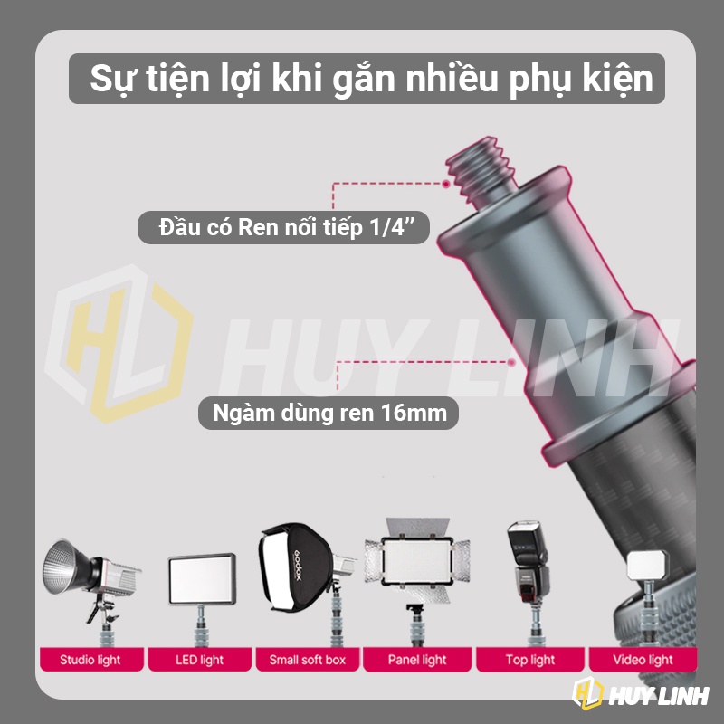 - Sử dụng cho: Máy ảnh Mirroless, DSLR, Smartphone, Đèn trợ sáng, Gắn tấm tản sáng