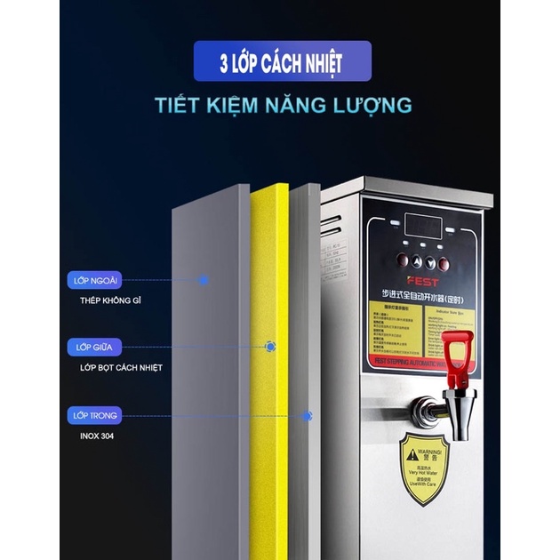 "Máy đun nước siêu tốc FEST – RC10 là dòng máy có khả năng đun nước siêu tốc trong vòng vài phút với 10 lít nước. Máy còn có khả năng giữ nhiệt tối ưu, giúp bạn có thể sử dụng nước sôi vào bất kì thời điểm nào trong ngày.Cấu tạo của máy: