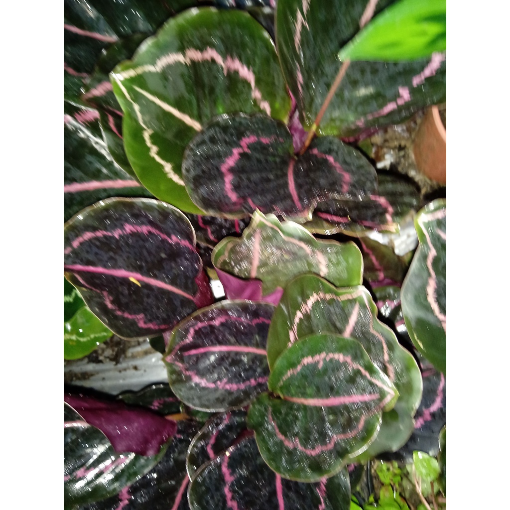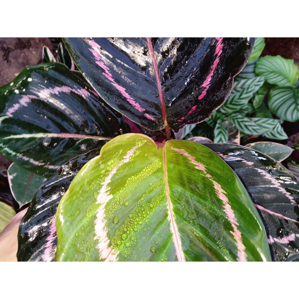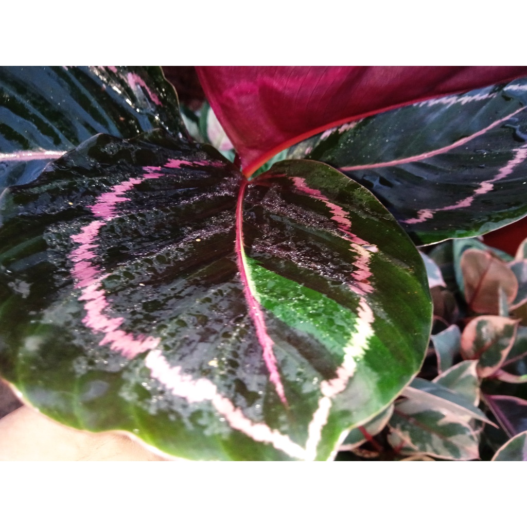 Là loại đuôi công lá bầu - Bản lá to và cứng, cuống lá mập và vững để giữ lá được thẳng.Mỗi lá có viền ren màu hồng chạy vòng cách mép lá tầm 1-2cm trông rất lạ mắt