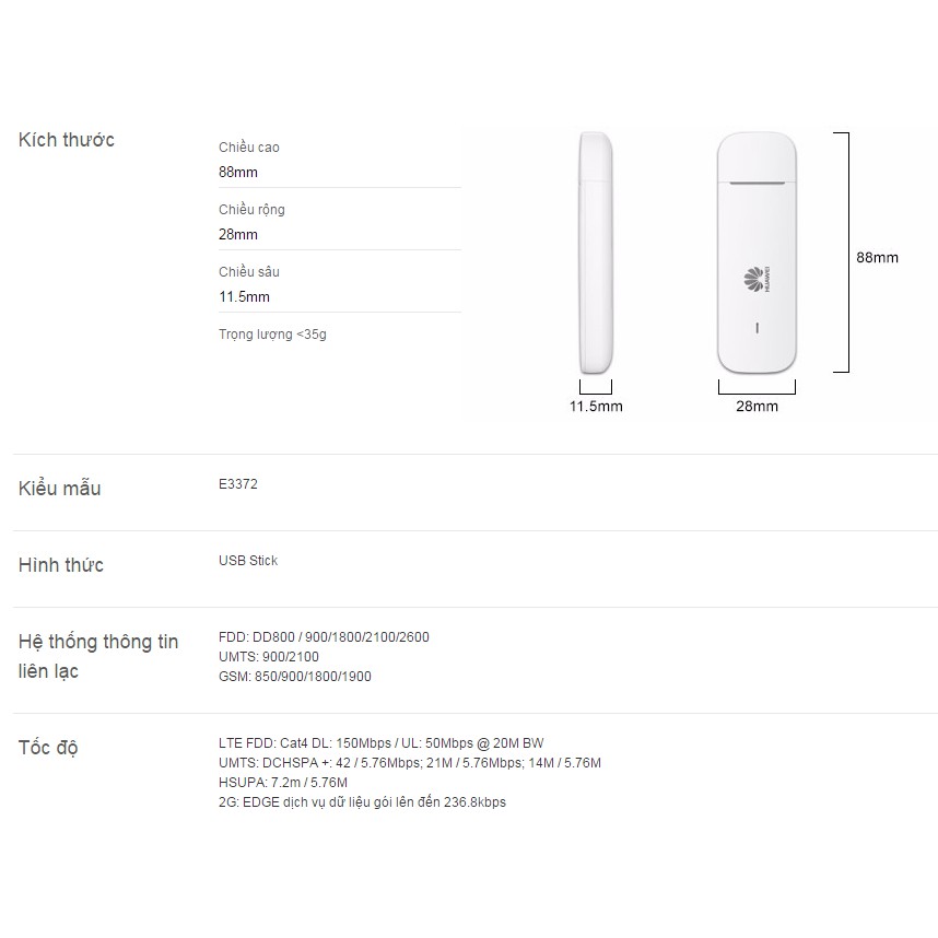 Thiết bị wifi 4G Huawei E3372 tốc độ 150Mbps chuẩn 4G-LTE sử dụng cho các thuê bao sim 4G của nhà mạng Viettel, Vinaphone, Mobifone, Vietnamobile đều được.