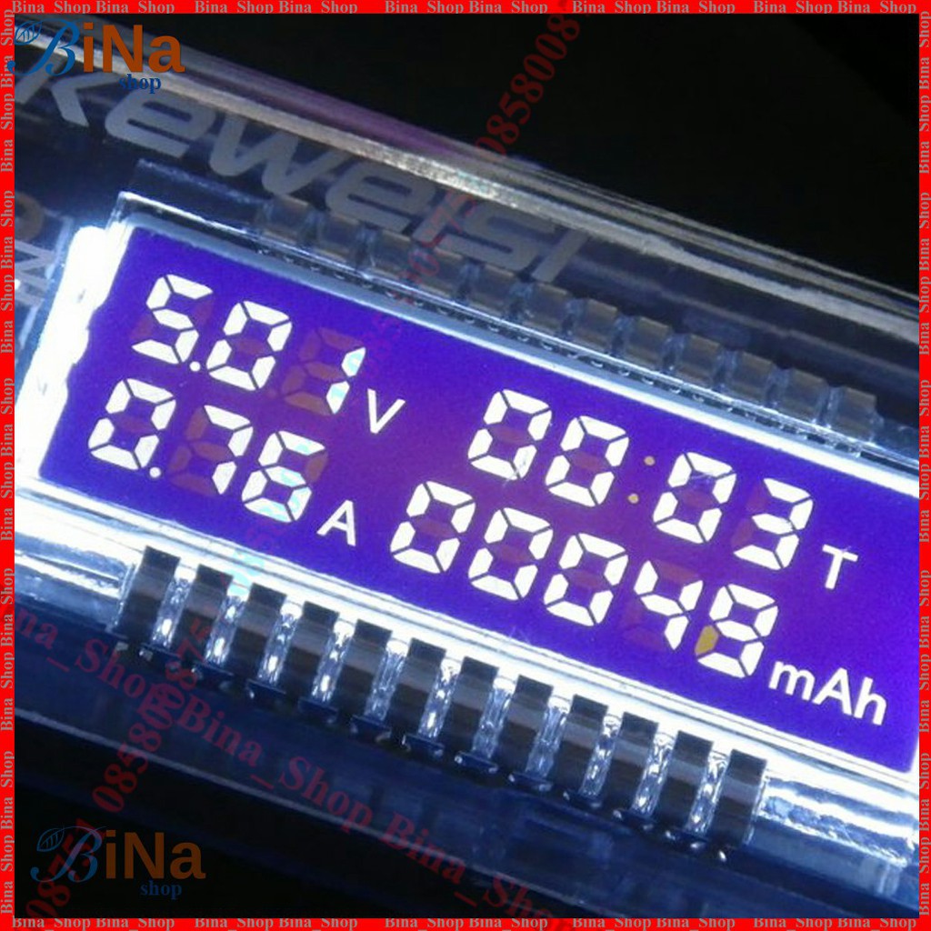 Màn hình hiển thị : Điện áp (V), dòng tiêu thụ (A), dung lượng đo được (mAh), thời gian đo (T) (phút) ...