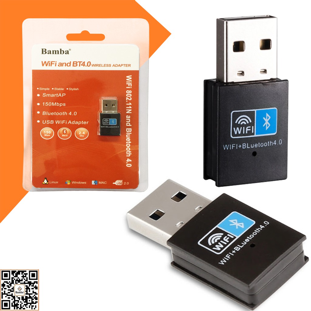 Usb Thu Wifi+ Bluetooth 4.0 BAMBA cho phép kết nối dữ liệu không dây giữa máy tính và các thiết bị có hỗ trợ Bluetooth, các thiết bị Kỹ thuật số cá nhân, và các thiêt bị khác có thể kết nối không dây với máy tính của bạn. Các thiết bị có thể kết nối với nhau trong phạm vi 20m.Phần mềm hỗ trợ: Phần mềm Bluetooth của Microsoft, CSR Harmony, Bluez, Bluesol
