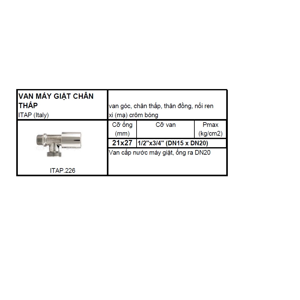 Sản phẩm: Van cấp nước máy giặt chân ngắn Italy phi 21x27mm art.266Kích thước khả dụng: 1/2 " x 3/4" (21x27mm).