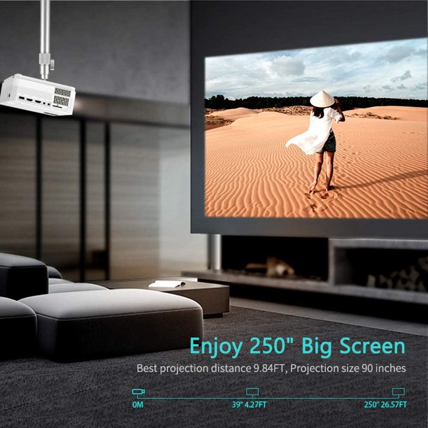 ◾ Màn hình lớn 250 inch độc đáo, VANKYO Leisure 470 có phạm vi từ 4,27 feet đến 26,57 feet và kích thước màn hình tối đa là 250 inch. Khoảng cách chiếu tối ưu là 9,84 feet để đạt được kích thước chiếu tối ưu là 90 inch. Bạn có thể thưởng thức bữa tiệc hình ảnh trên màn ảnh rộng trong khi đặt máy chiếu mini một cách linh hoạt ở bất cứ đâu!