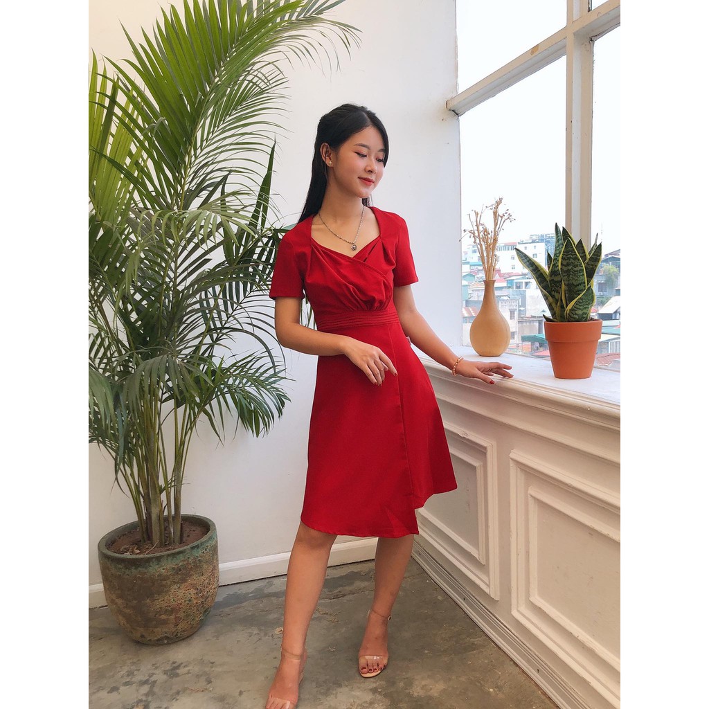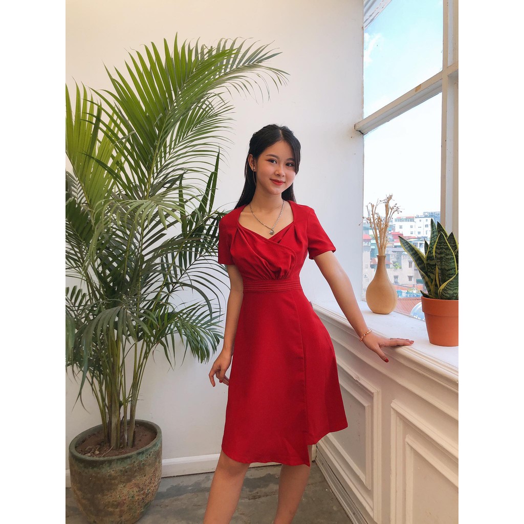 Giới thiệu Váy ôm đỏ xếp ly vặn ở cổ