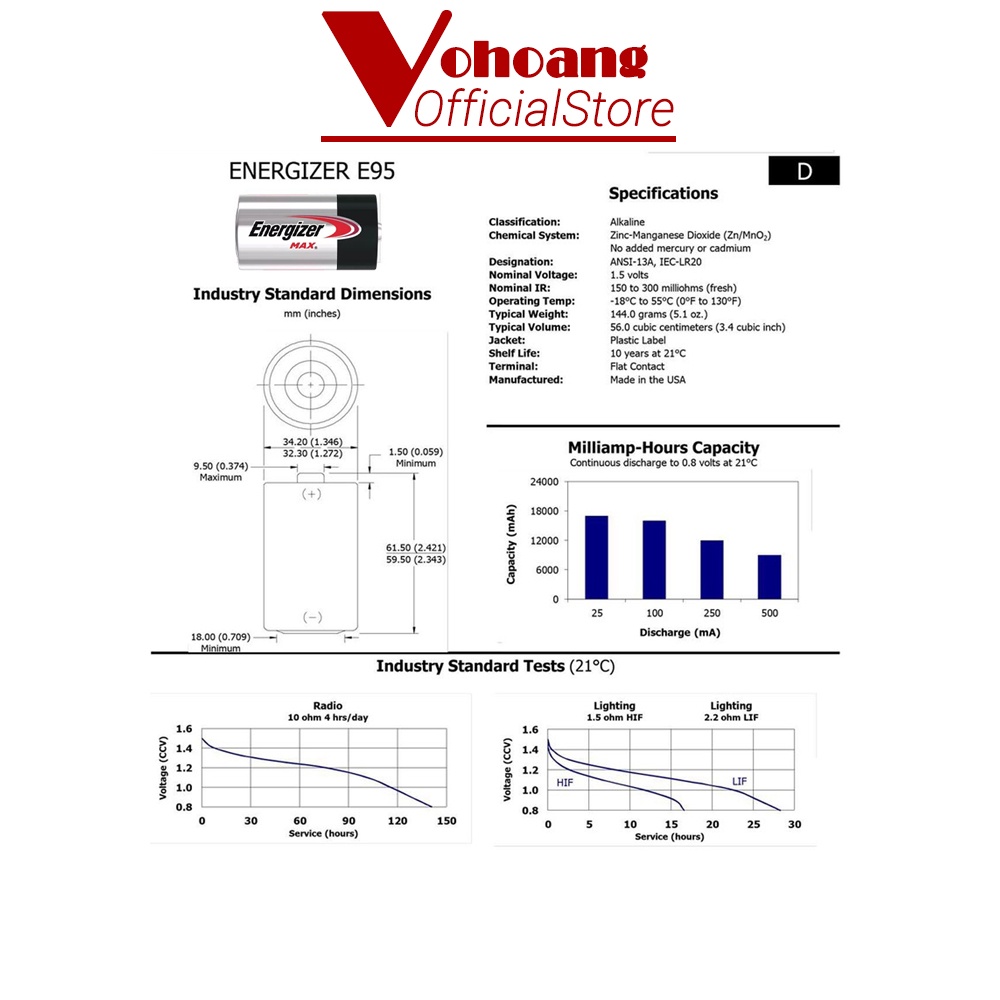 📌 Chủng pin: Pin D / Pin đại / E95 / R20 / LR20