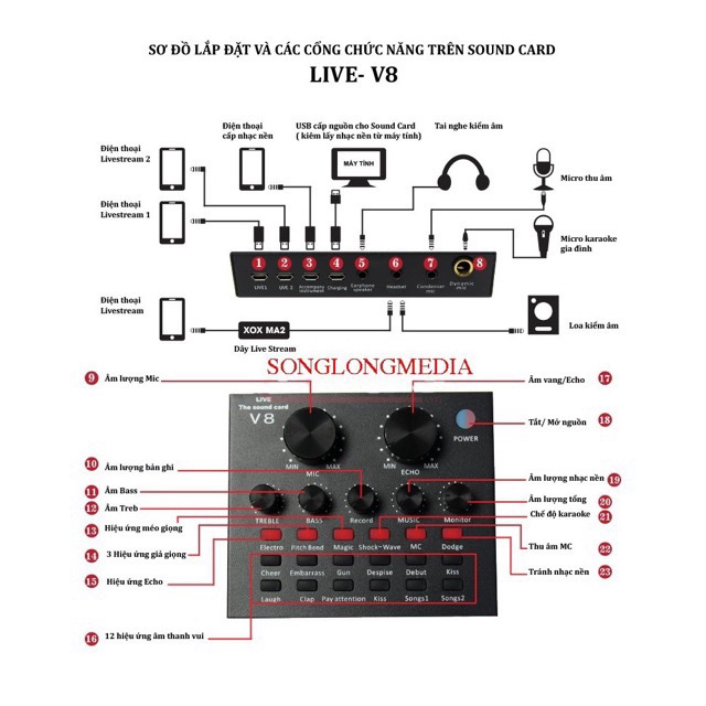 Sound card thu âm V8 là sản phẩm card âm thanh tương thích với nhiều thiết bị như smartphone, laptop, pc, máy tính bảng. Với tính năng làm méo giọng hát, thành giọng trẻ em, người già, Khả năng chèn các hiệu ứng âm thanh vào các đoạn thu như tiếng vỗ tay, tiếng hò reo, nhạc cổ vũ, tiếng chim kêu... với 12 hiệu ứng âm thanh, sẽ đem lại cho bạn trải nghiệm thu âm vô cùng thú vị.