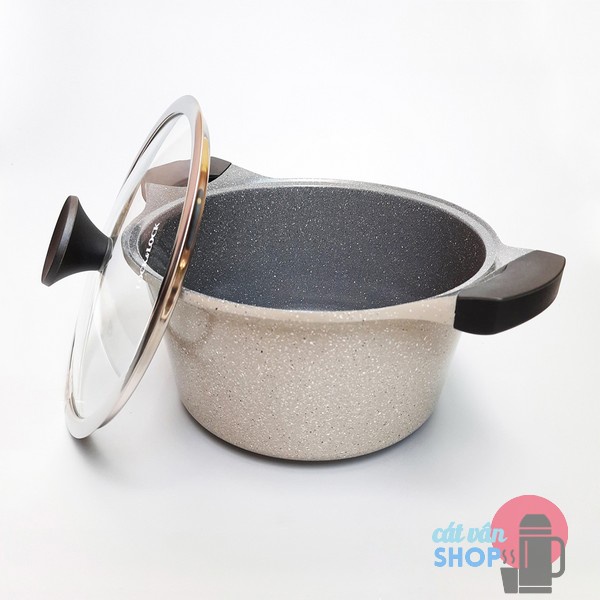 Chất liệu : Thân nhôm đúc nguyên khối, bên trong được tráng lớp chống dính, bên ngoài phủ lớp sơn chịu nhiệt, với công nghệ thiết kế 7 lớp cao cấp. Tay cầm bằng nhựa. Nắp nồi thủy tinh, vòng viền quanh nắp thép không gỉ