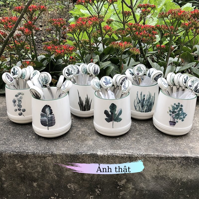 Nhà cửa & Đời sống > Bộ đồ bàn ăn > Dĩa || [Video thật] Dĩa ăn hoa quả, dĩa ăn trái cây inox tay cầm gốm kèm lọ đựng bằng sứ họa tiết cây lá nhiệt đớiCòn hàng