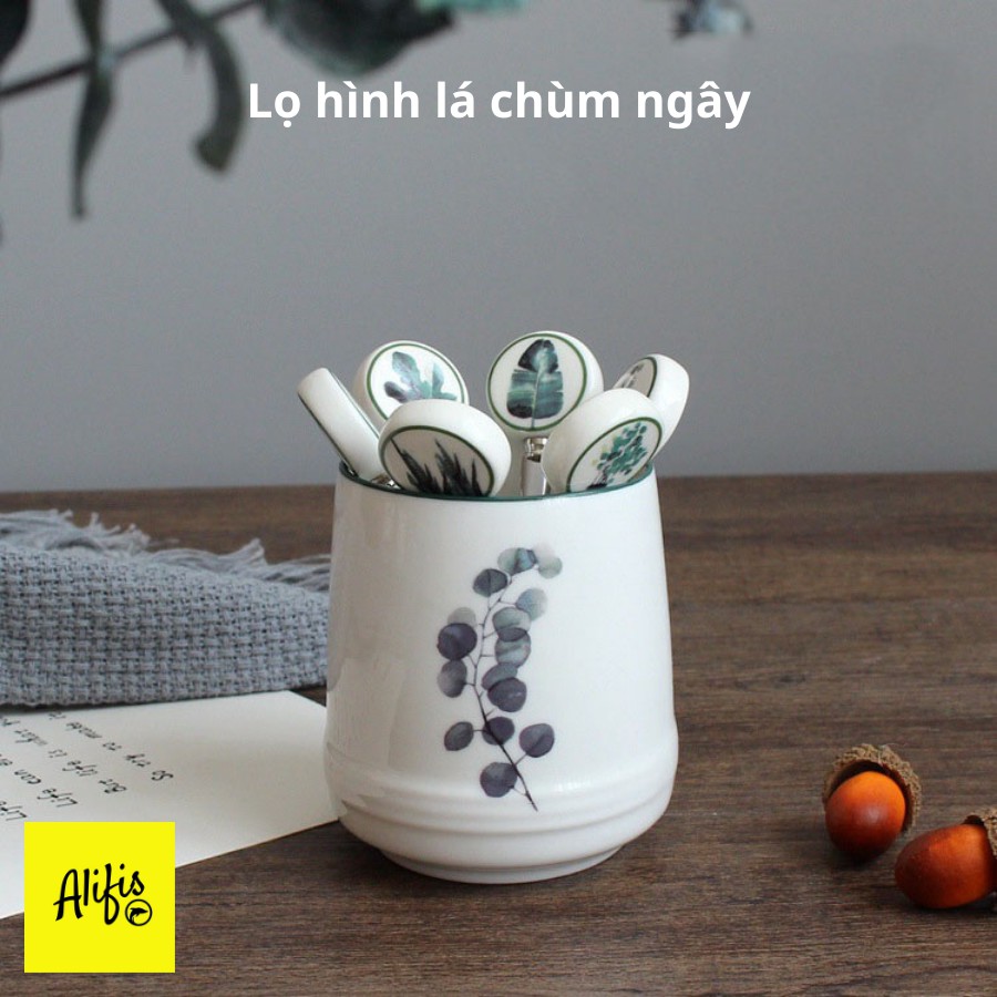 - Sản phẩm: Dĩa ăn hoa quả, dĩa ăn trái cây inox tay cầm gốm kèm lọ đựng bằng sứ họa tiết cây lá nhiệt đới