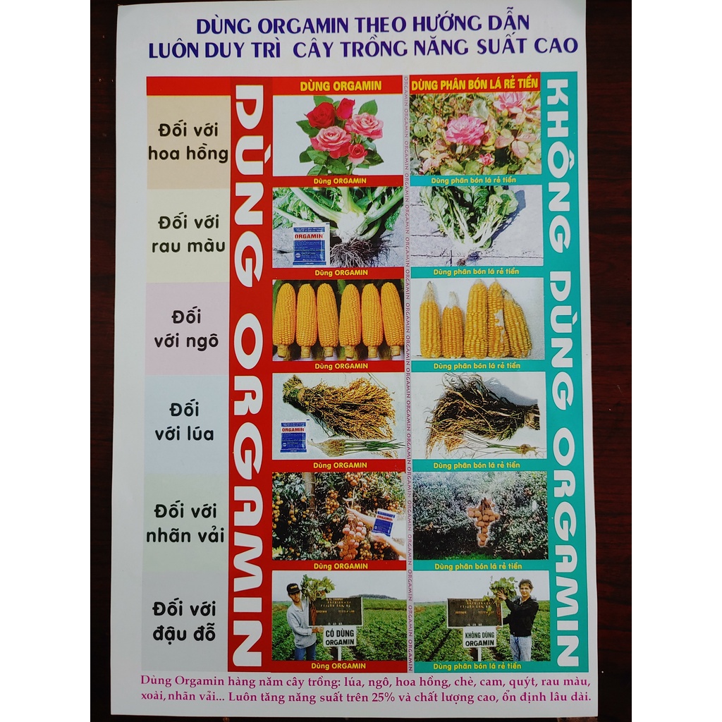 - Hoa hồng, hoa lan: Pha 20ml Orgamin cho bình 16-25 lít nước, phun ướt đều, đẫm trên lá, thân cây giúp bông to mập, màu sắc đẹp. Phun trước khi thu hoạch 10 ngày và phun định kỳ 15 ngày 1 lần.