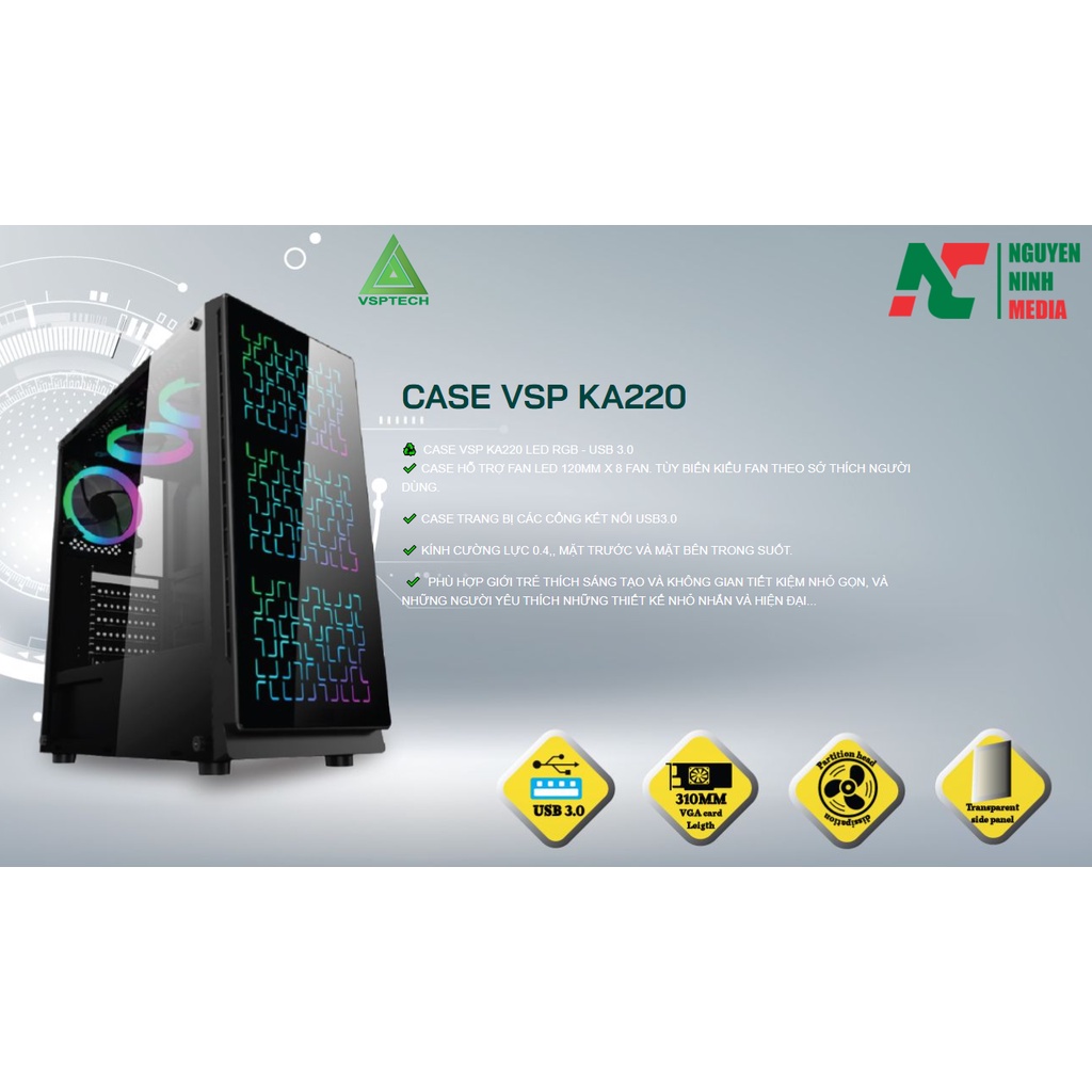 Case VSP KA-220✔️ Case được thiết kế để trang bị hệ thống đèn Led đa sắc RGB lung linh ở mặt trước và hệ thống fan led 120mm tùy chọn gắn thêm (không kèm theo fan).