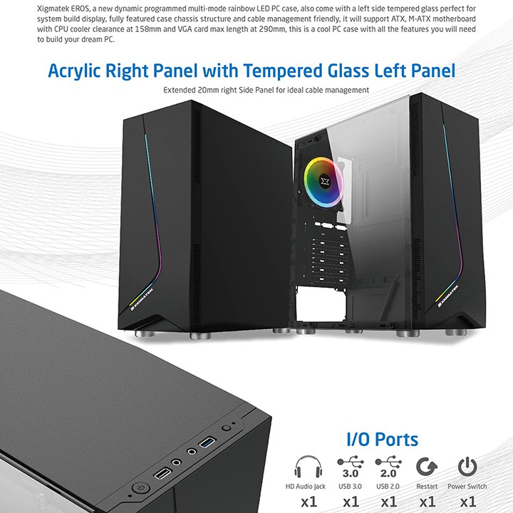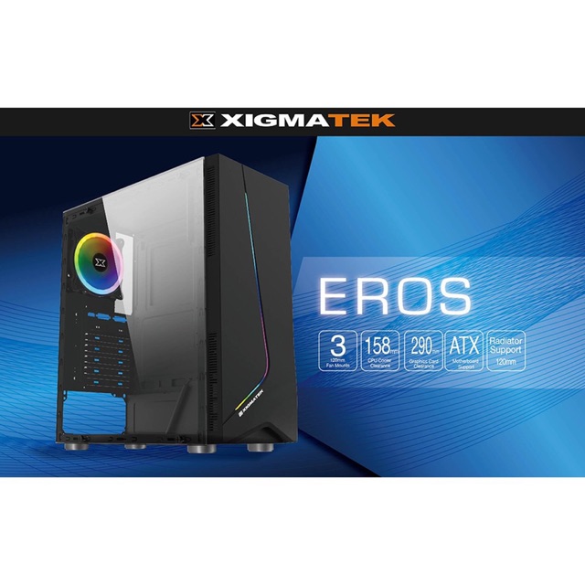 Xigmatek EROS, một vỏ PC LED cầu vồng đa chế độ được lập trình năng động mới, cũng đi kèm với một kính cường lực bên trái hoàn hảo cho màn hình xây dựng hệ thống, cấu trúc khung vỏ đầy đủ tính năng và quản lý cáp thân thiện, nó sẽ hỗ trợ bo mạch chủ ATX, M-ATX với CPU khe hở làm mát ở 158mm và chiều dài tối đa của card VGA là 290mm, đây là một vỏ máy tính tuyệt vời với tất cả các tính năng bạn sẽ cần để xây dựng chiếc PC mơ ước của mình.