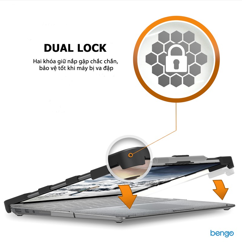 Vỏ ốp lưng với ''Khóa an toàn - Dual-lock" giữ cho vỏ ốp không tự mở ra khi bạn không sử dụng, bảo vệ an toàn cho Surface Laptop.