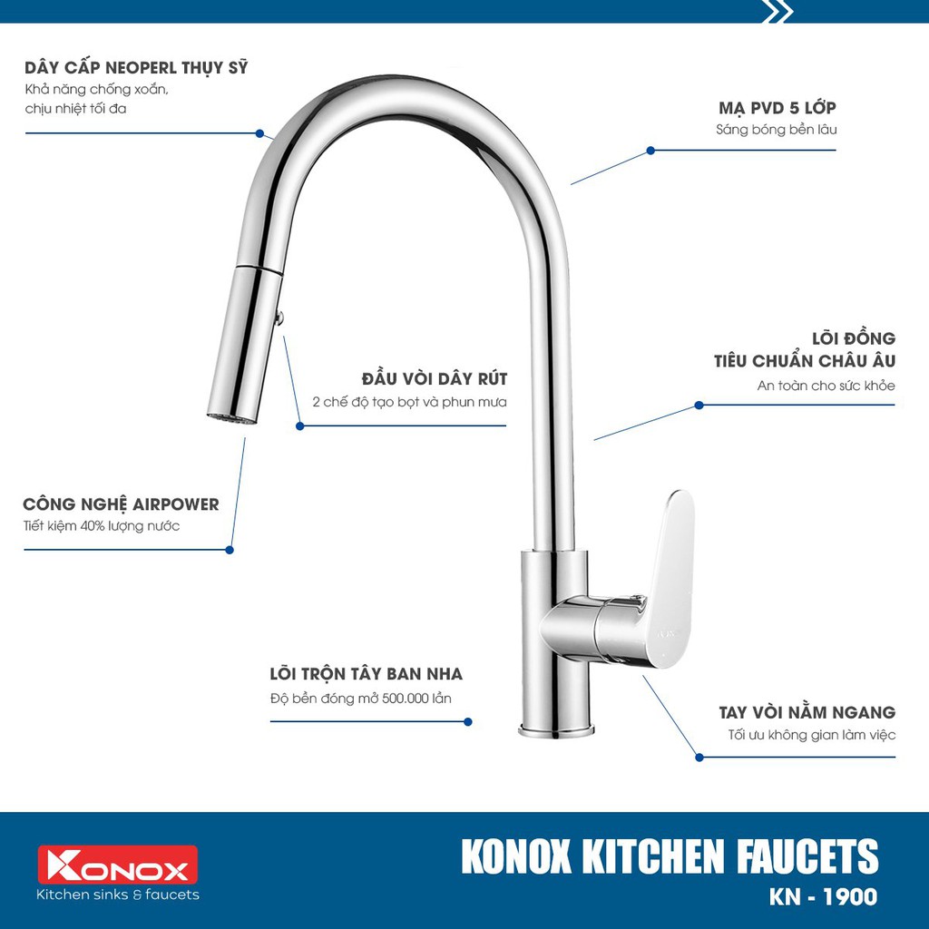 Nhà cửa & Đời sống > Dụng cụ & Thiết bị tiện ích > Chậu rửa & vòi nước || Vòi rửa bát rút dây KONOX KN1900 hợp kim đồng 61% tiêu chuẩn Châu Âu CW617N, bề mặt xử lý công nghệ PVD Chrome 5 lớpCòn hàng