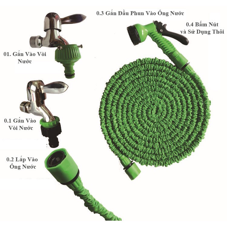 - Kích thước: chiều dài bình thường 7.5m, co giãn tối đa 22.5m (tùy theo lực nước sẽ có độ giãn nở khác nhau), giúp cho việc tưới cây, rửa xe của bạn trở nên dễ dàng, đơn giản hơn.