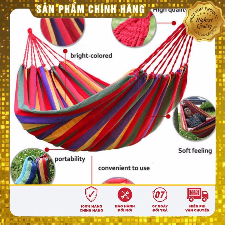 - Võng du lịch được thiết kế dáng cầu vồng, 2 đầu dây chắc chắn cùng dây dù đi kèm. Có thể buộc ở bất cứ đâu có cây, cọc…
