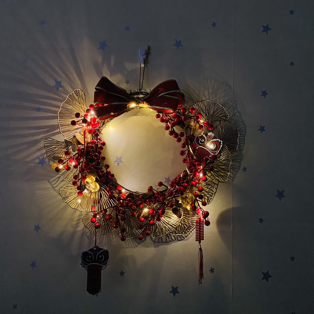Nhà cửa & Đời sống > Trang trí nhà cửa > Hoa trang trí || Vòng hoa đào đông đỏ trang trí tết có đèn H36Còn hàng