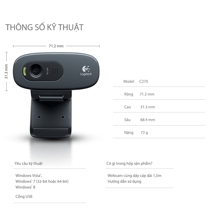 Webcam Logitech C270 HD 720P - Hàng Chính HãngWebcam Logitech C270 (HD) sẽ là trợ thủ đắc lực giúp bạn có thể nhìn thấy người thân bạn bè ở xa qua những cuộc gọi video hay những video clip tự quay. Đồng thời, C270 mang đến cho bạn hình ảnh tươi sáng với những âm thanh rõ ràng dưới sự trợ giúp của công nghệ Fluid Crystal.