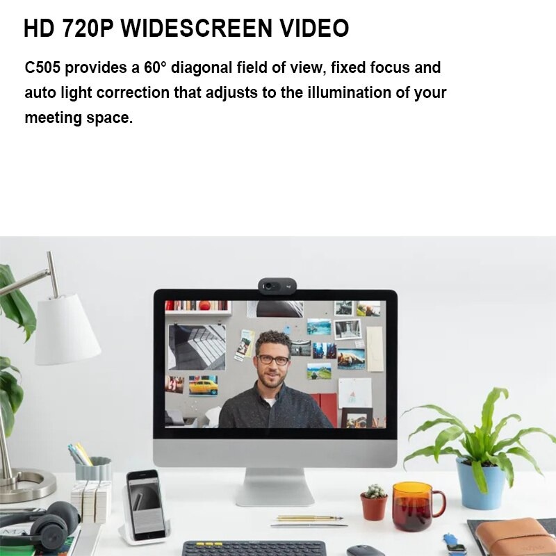 Thiết lập từ quang học máy tính xách tay tích hợp với chiếc webcam đem lại chất lượng video sắc nét, mượt mà và rực rỡ với độ phân giải màn hình rộng 720p HD/30 fps. C505 đem lại tầm nhìn chéo 60°, khả năng lấy nét cố định và điều chỉnh ánh sáng tự động, điều chỉnh theo ánh sáng không gian họp của bạn.