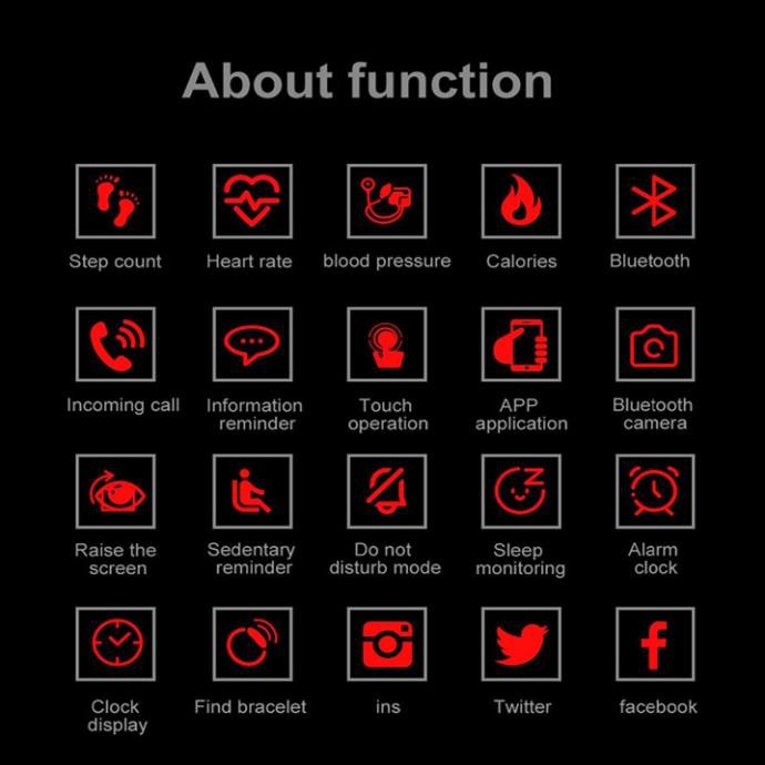 Đồng hồ thông minh Smart band 115Plus giúp đo nhịp tim, huyết áp, theo dõi lượng oxy trong máu, đo bước đi (cảm biến 3D), lượng calo tiêu thụ, khoảng cách đi được, kết nối Bluetooth, nhắc nhở cuộc gọi, nhắc nhở thông tin, kích hoạt màn hình bằng cách giơ tay, đồng hồ báo thức thông minh, chế độ tìm vòng tay, chụp ảnh từ xa, nhắc nhở ít vận động, theo dõi giấc ngủ, lưu ý thông tin (SMS, Wechat, QQ, Facebook, Twitter, WhatsAPP, vv)