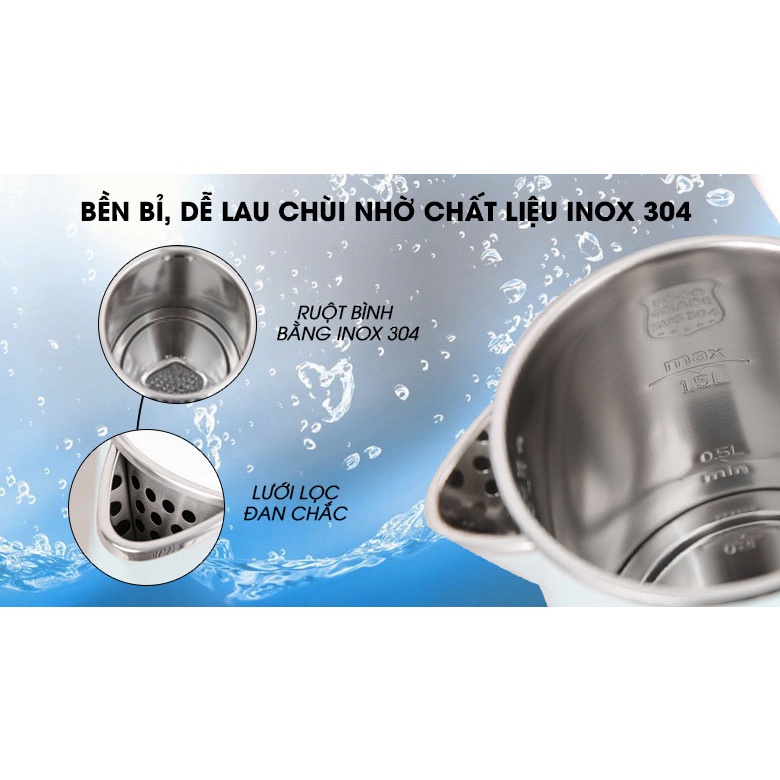 Ruột bình đun siêu tốc bằng inox cao cấp SUS 304 bóng loáng, an toàn cho sức khỏe, không phản ứng với nước, không sinh chất độc hại, dễ làm sạch