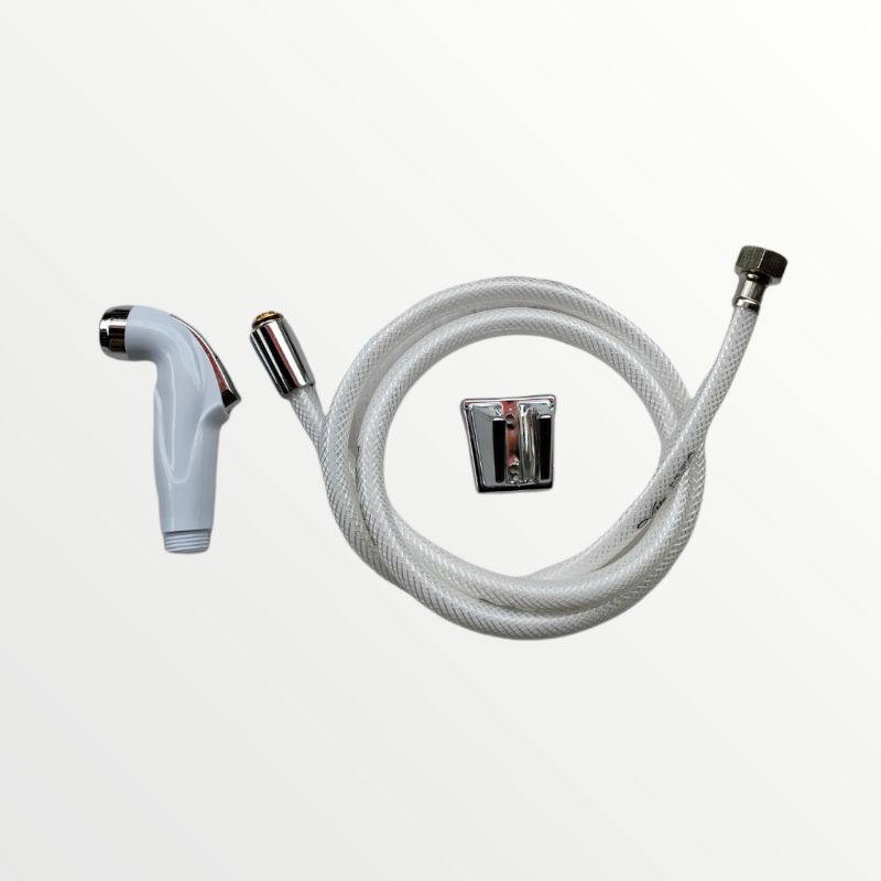 Bộ sản phẩm gồm: Đầu vòi xịt + Dây dẫn + Đầu gác vòi.