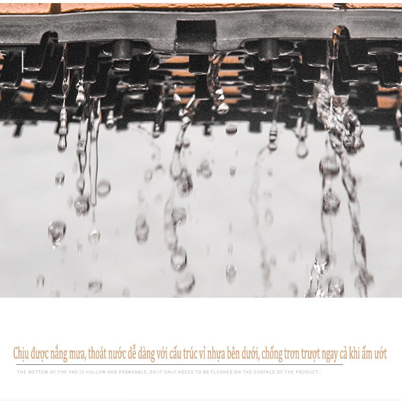 Cấu trúc mở giúp thoát nước tối đa và thoáng khí, bên trên là các nan GỖ TRÀM được thiết kế có rãnh nhỏ giữa các nan, bên dưới là vỉ nhựa với kết cấu dạng lưới có chân đế thoát nước dễ dàng, không lo đọng vũng trên sàn và chống trơn trượt.