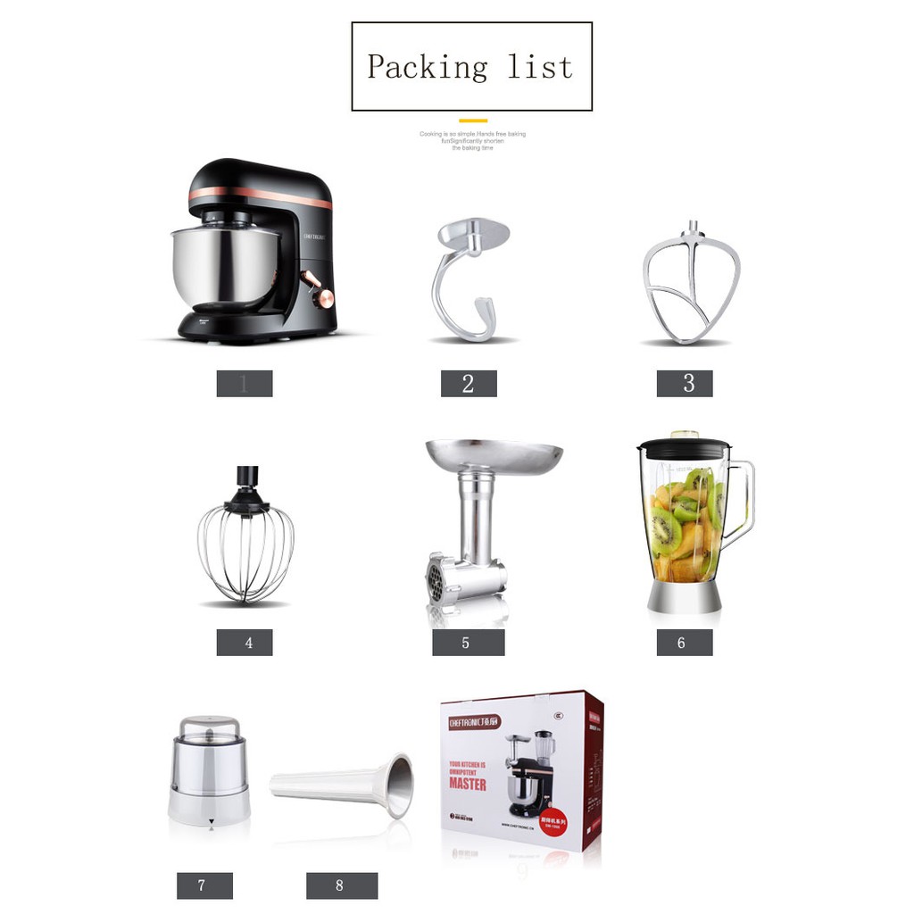 Bộ sản phẩm đa năng gồm 5 phụ kiện: 3 đầu đánh trứng, trộn salad, đánh kem. Cối xay sinh tố, máy đùn thịt xúc xích, cán mỳ, làm mỳ sợi. Sản phẩm đa năng chỉ cần có nó là có thể sơ chế mọi món ăn trong căn bếp nhà bạn rồi