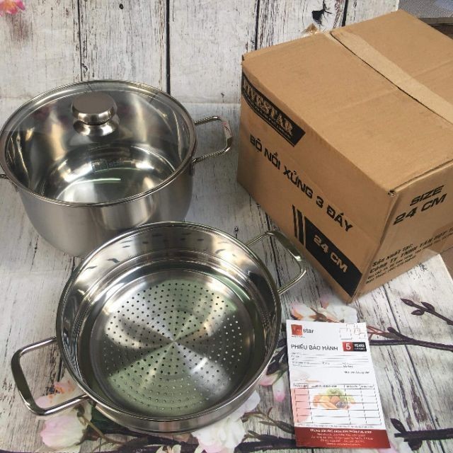 Bộ nồi xửng inox FIVESTAR 3 đáy bếp từ nắp kính- Bộ nồi được làm từ chất liệu inox cao cấp nhập khẩu từ Hàn Quốc, bóng đẹp, có độ bền cao, độ dày 8mm theo tiêu chuẩn Quốc Tế.- Nồi có 3 đáy, sử dụng tốt cho tất cả các loại bếp: bếp ga, bếp từ, bếp điện hồng ngoại…