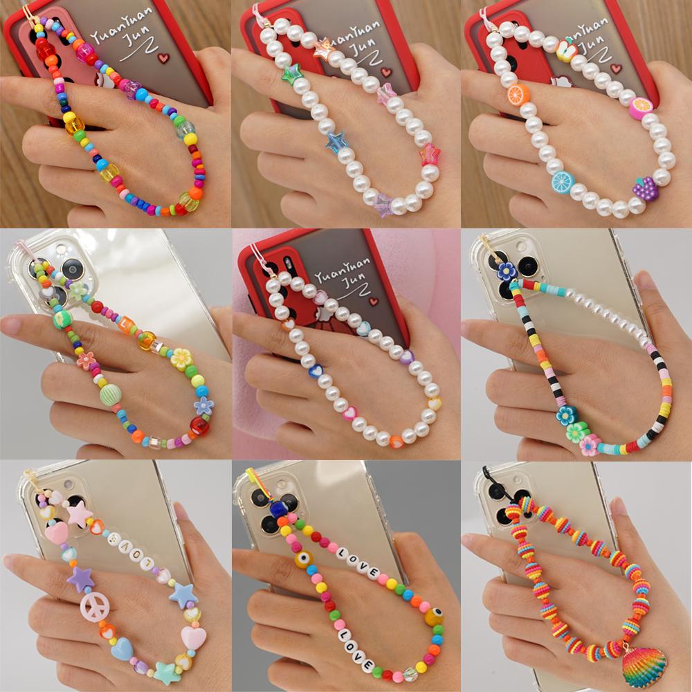 Giới thiệu ☆YOLA☆ Universal Phone Charm Strap Smile Pearl Necklace Strap Mobile Chain for Keys Multi Color Lanyard Girls Lady Gift Phone Case Hanging Cord Phone Choker